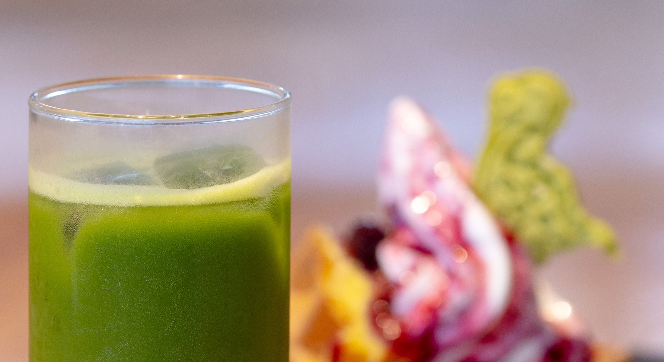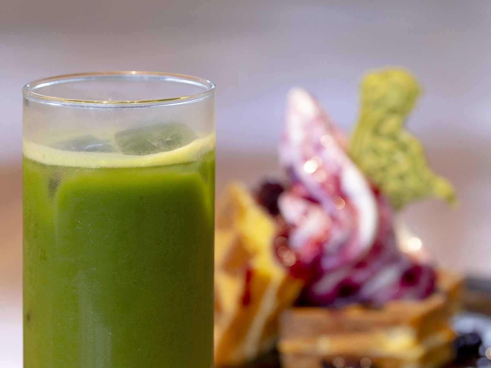 深みある味わいが特長の抹茶ラテや抹茶グリーンティー、手作りのワッフルをご用意。